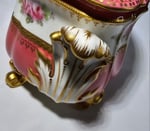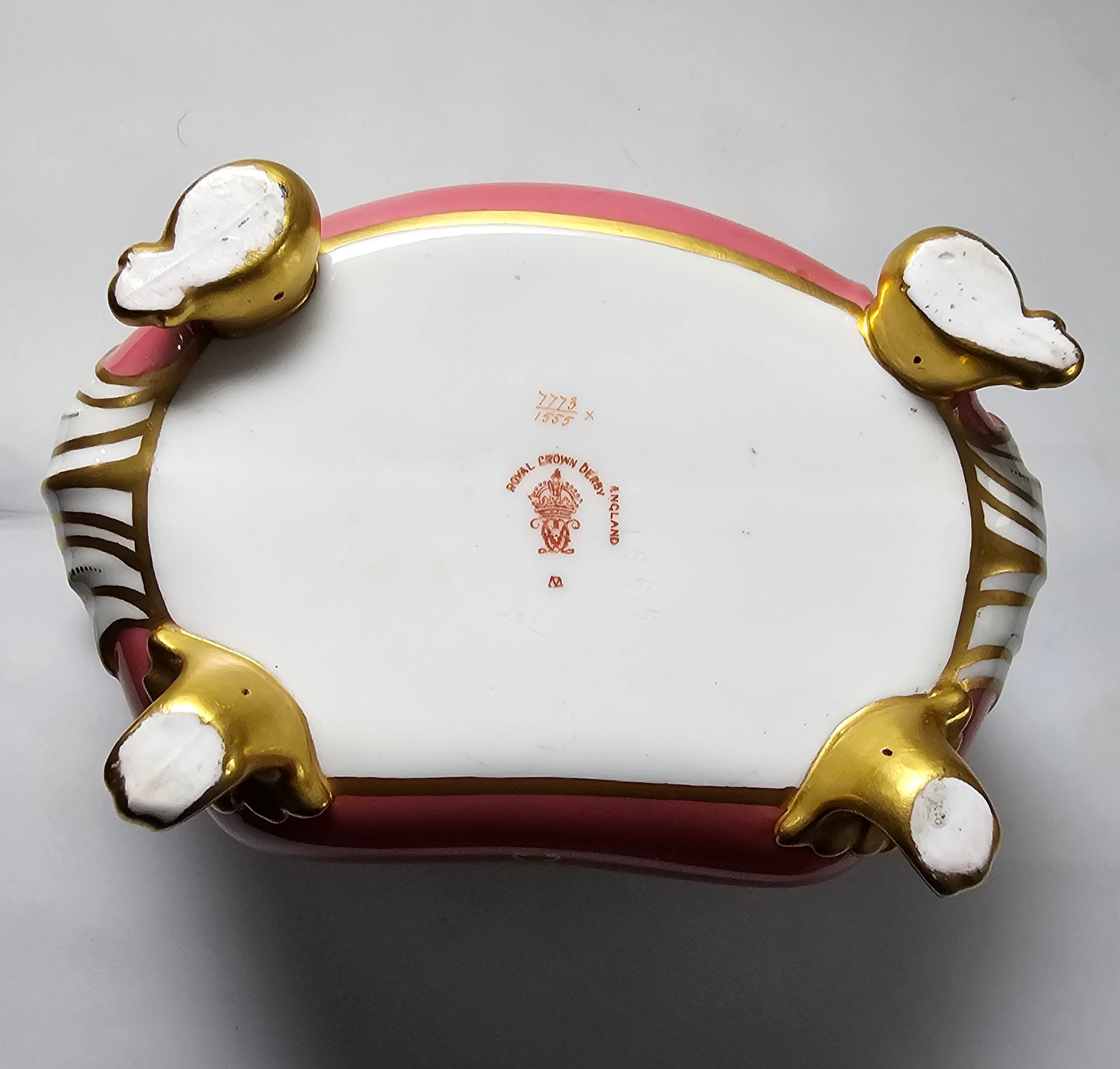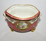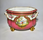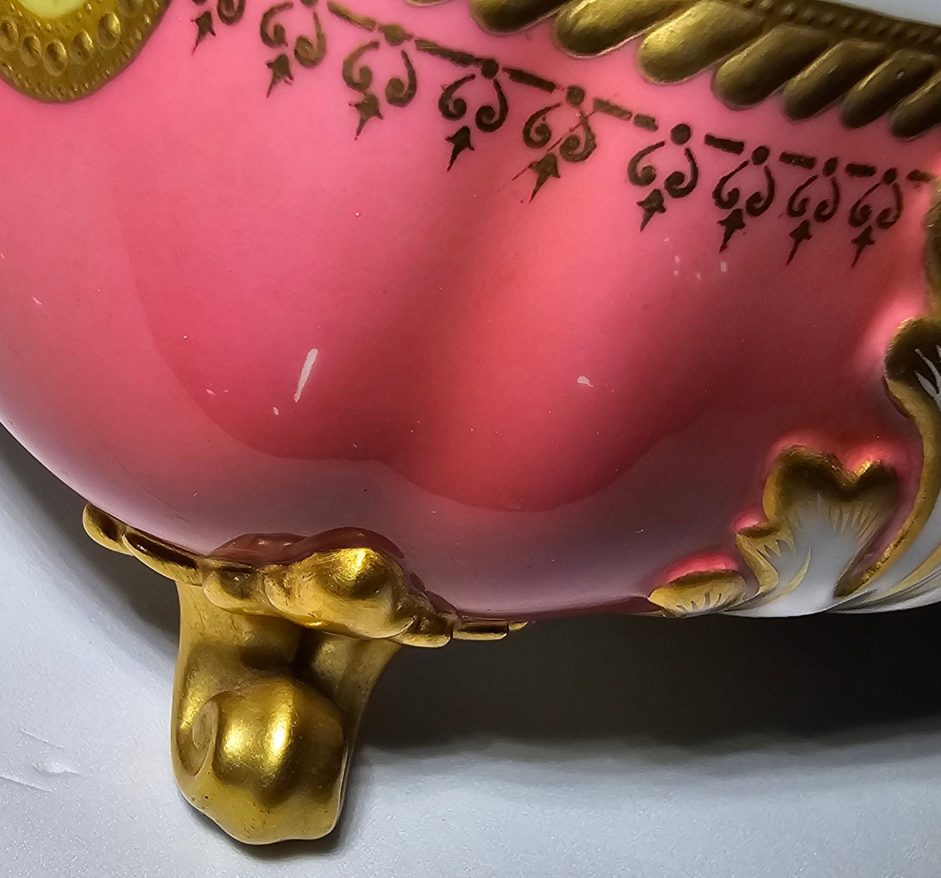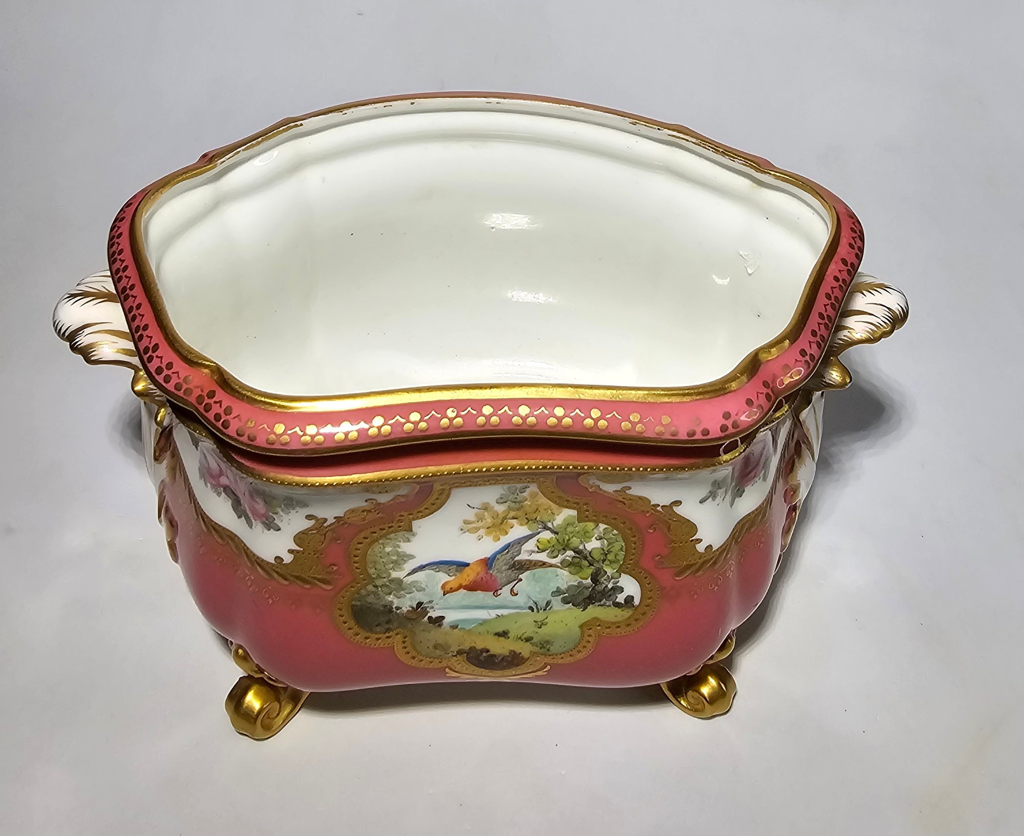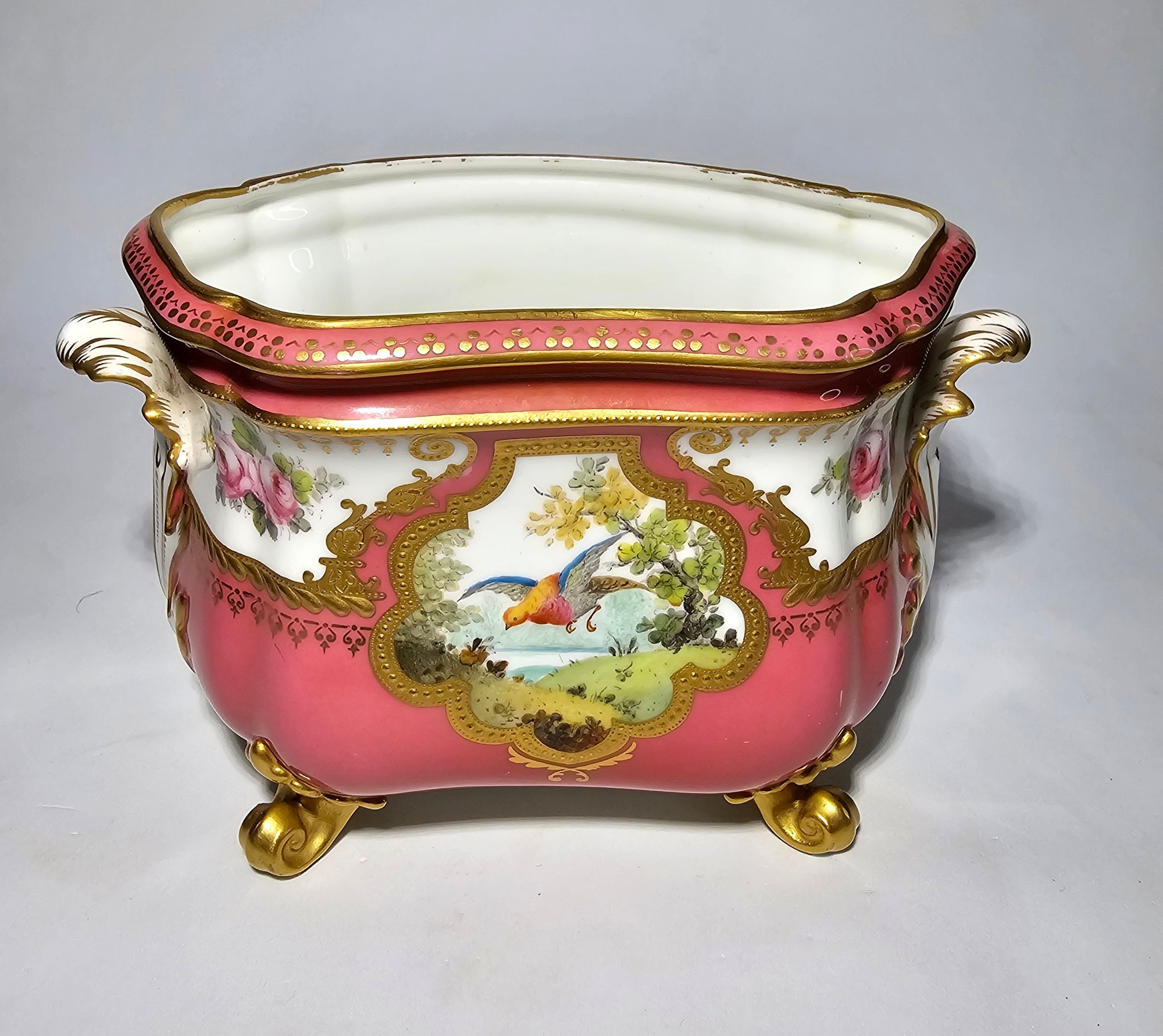 With an almost serpentine shaped front, this delightful bough pot stands on four gilded scroll feet. Decorated in a rose pink ground upon which are painted vignettes and borders of exotic birds and roses by artist C Harris, whose signature appears. White ground to the handles and border with gilt, further gilt highlights throughout enhance the overall decoration.