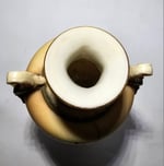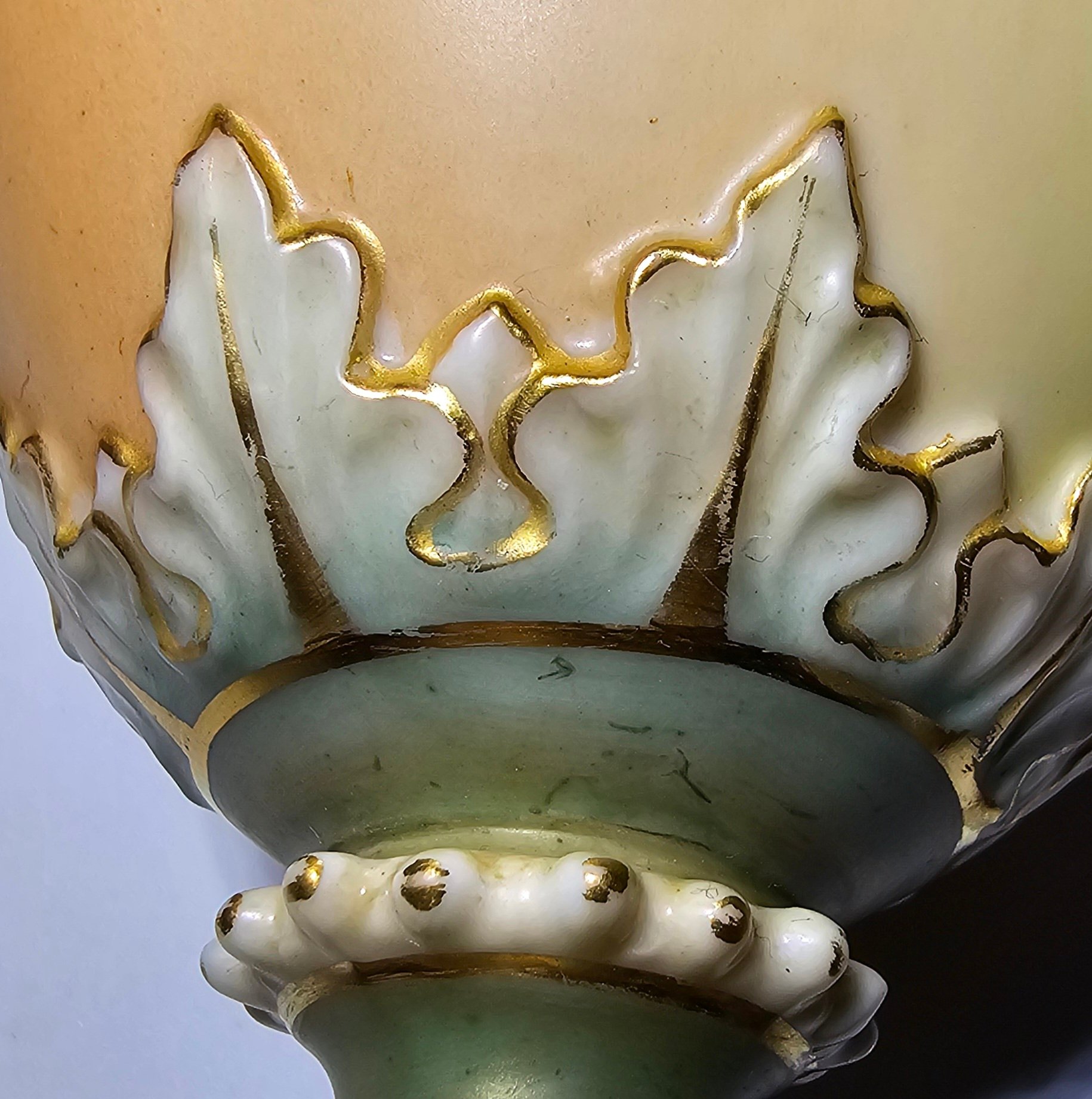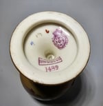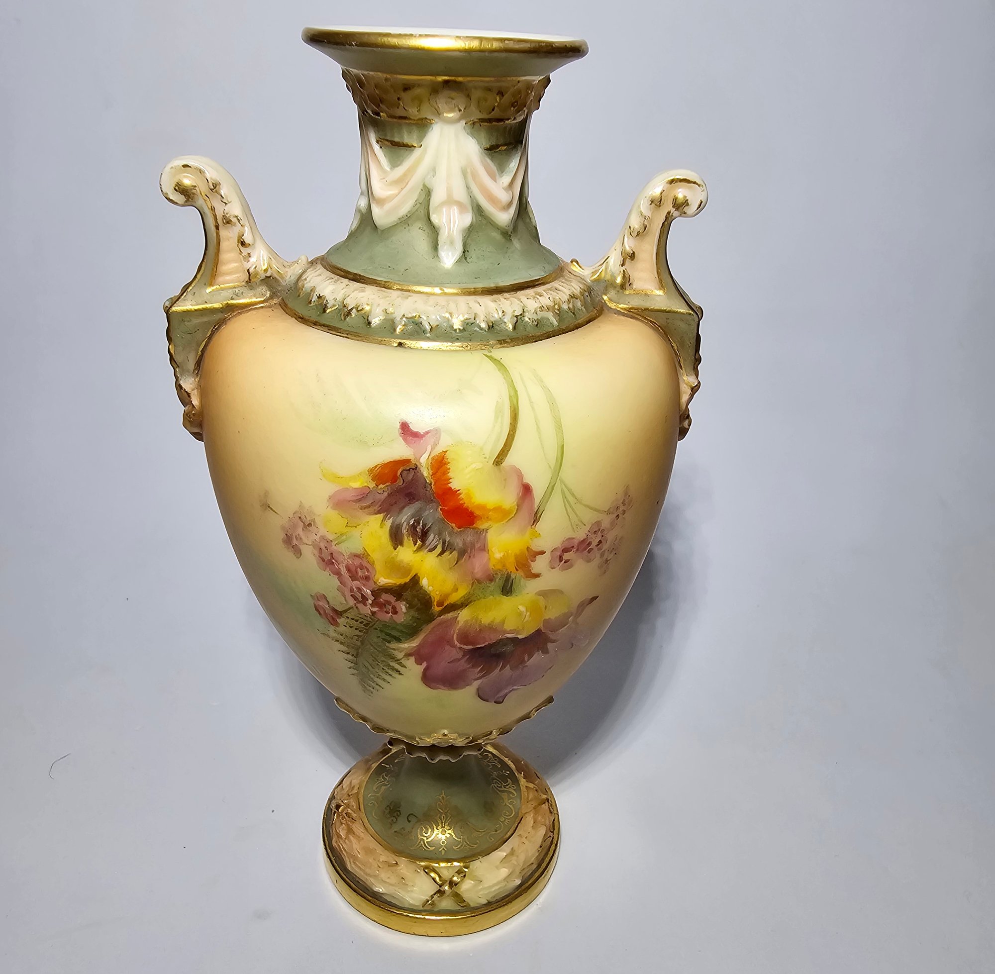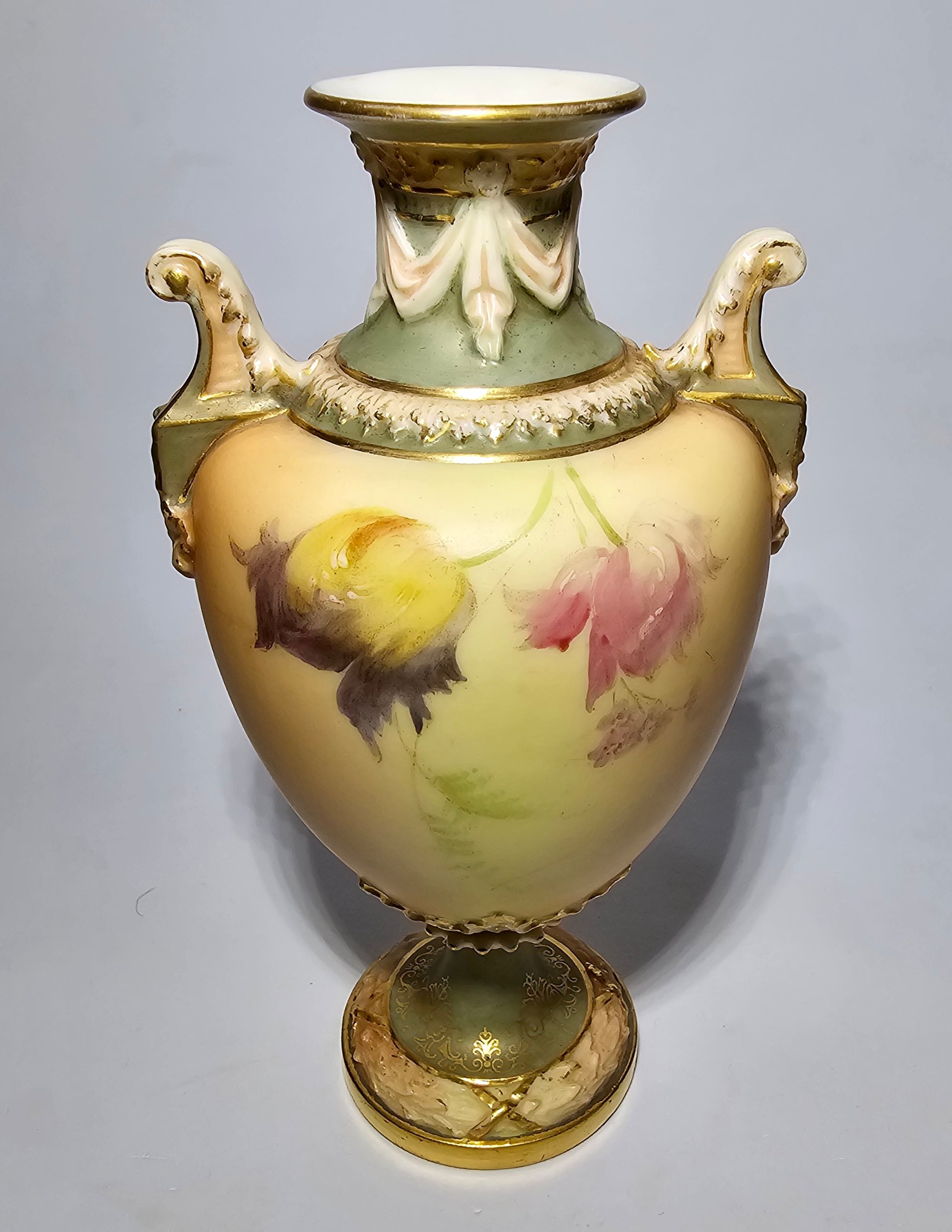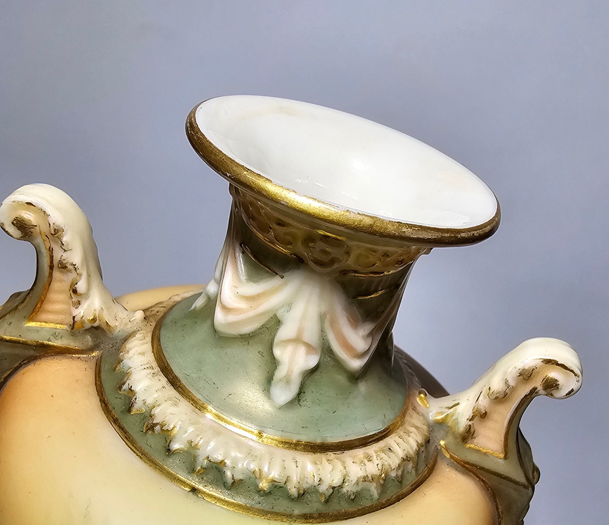 A smaller bulbous shaped vase with scroll handles. Decorated with hand painted flowers to the front and back upon a blush ivory ground. The neck is decorated with white coloured drapery over a green ground. The base foot is decorated in the same green ground on which is a raised wreath decoration with gilt highlights. Further raised decoration and gilt highlights to the base and neck raised collar.
