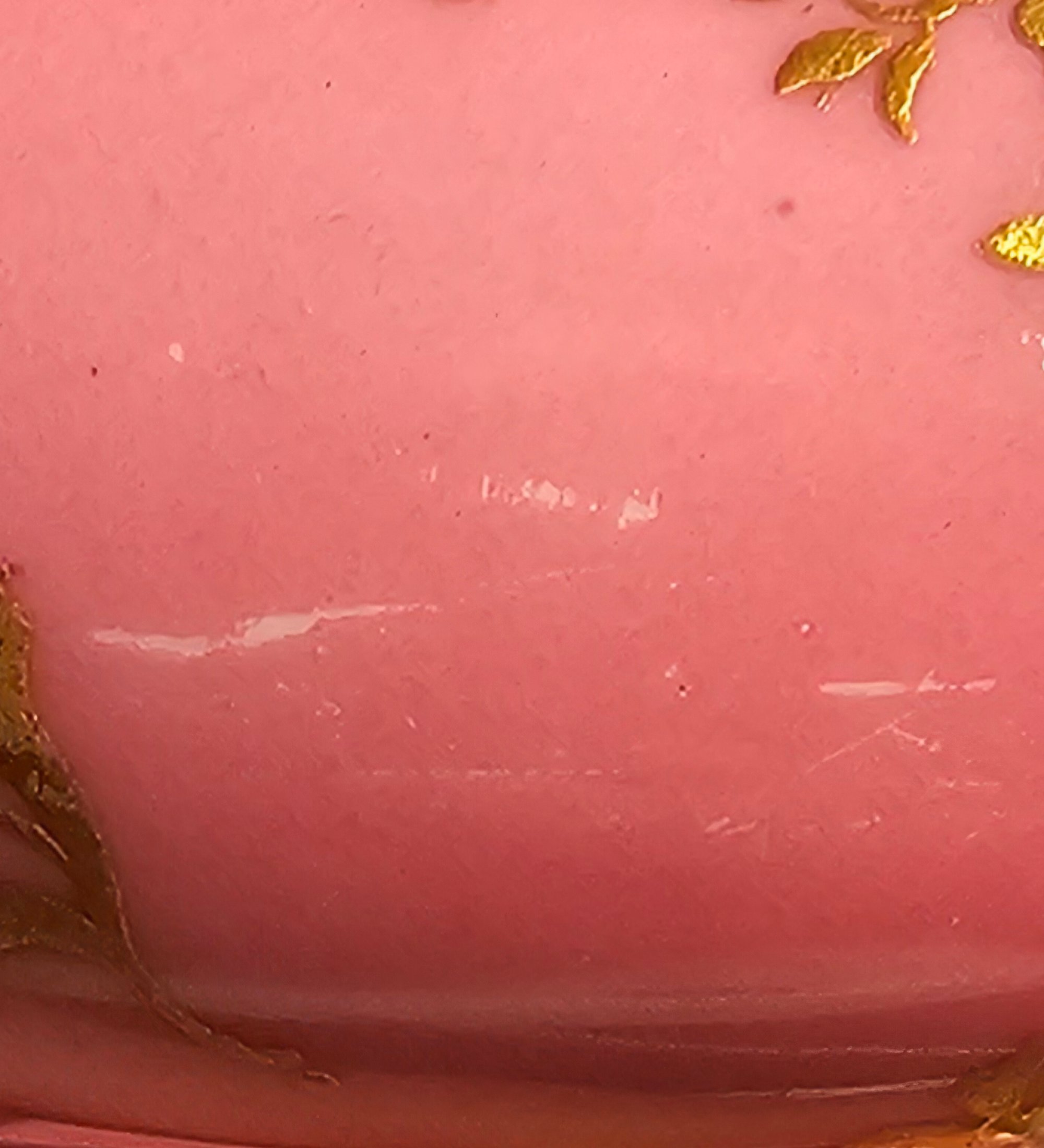 Condition: In good condition with no cracks, hairlines or repairs. There are minor scratches in the pink glaze to the reverse of the urn, but the rest of the glaze remains lustrous. The gilding to the base of the handles has very minor rubbing and there is also rubbing to the gilding on the base rim and corners.