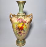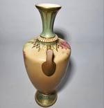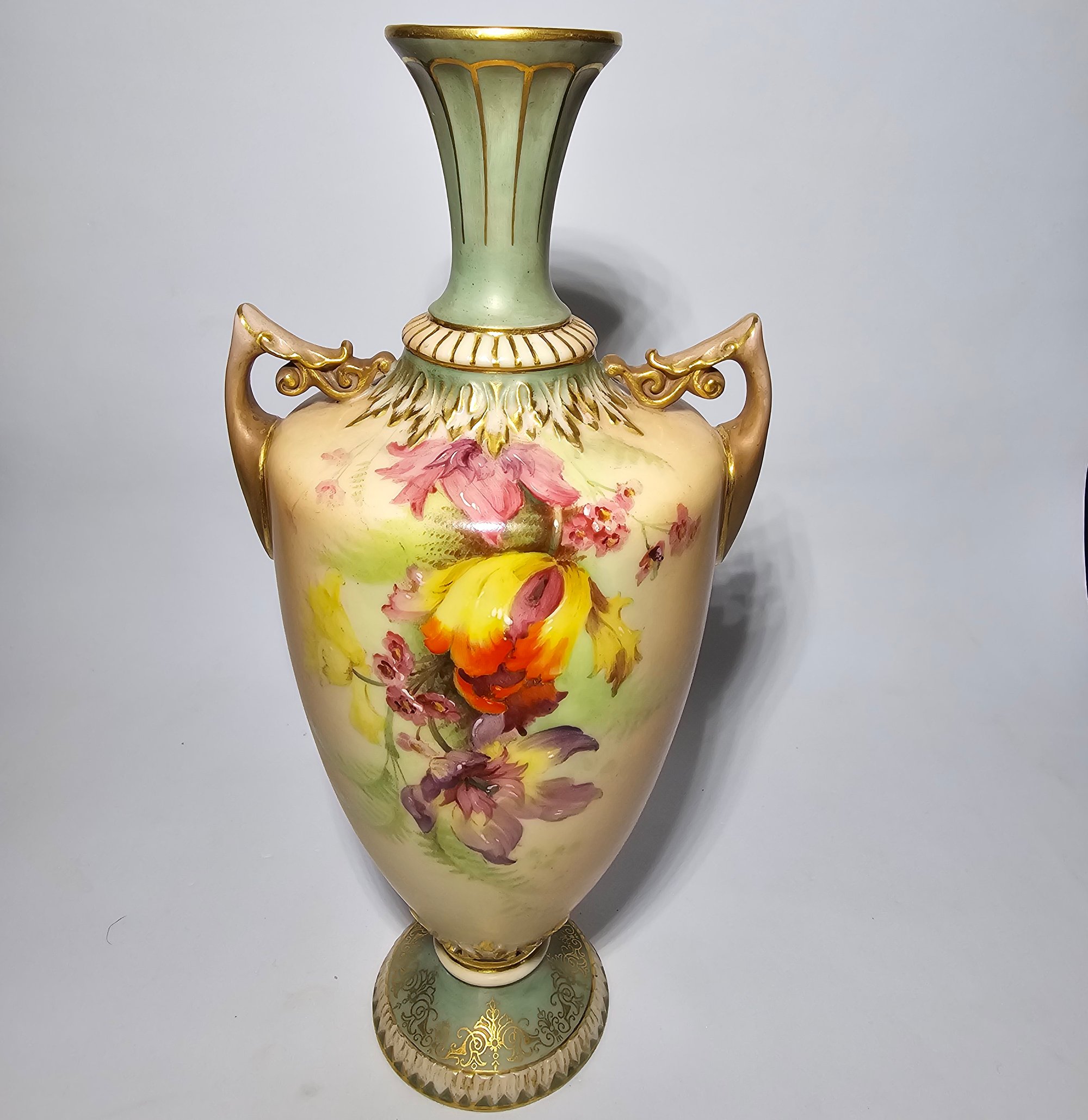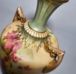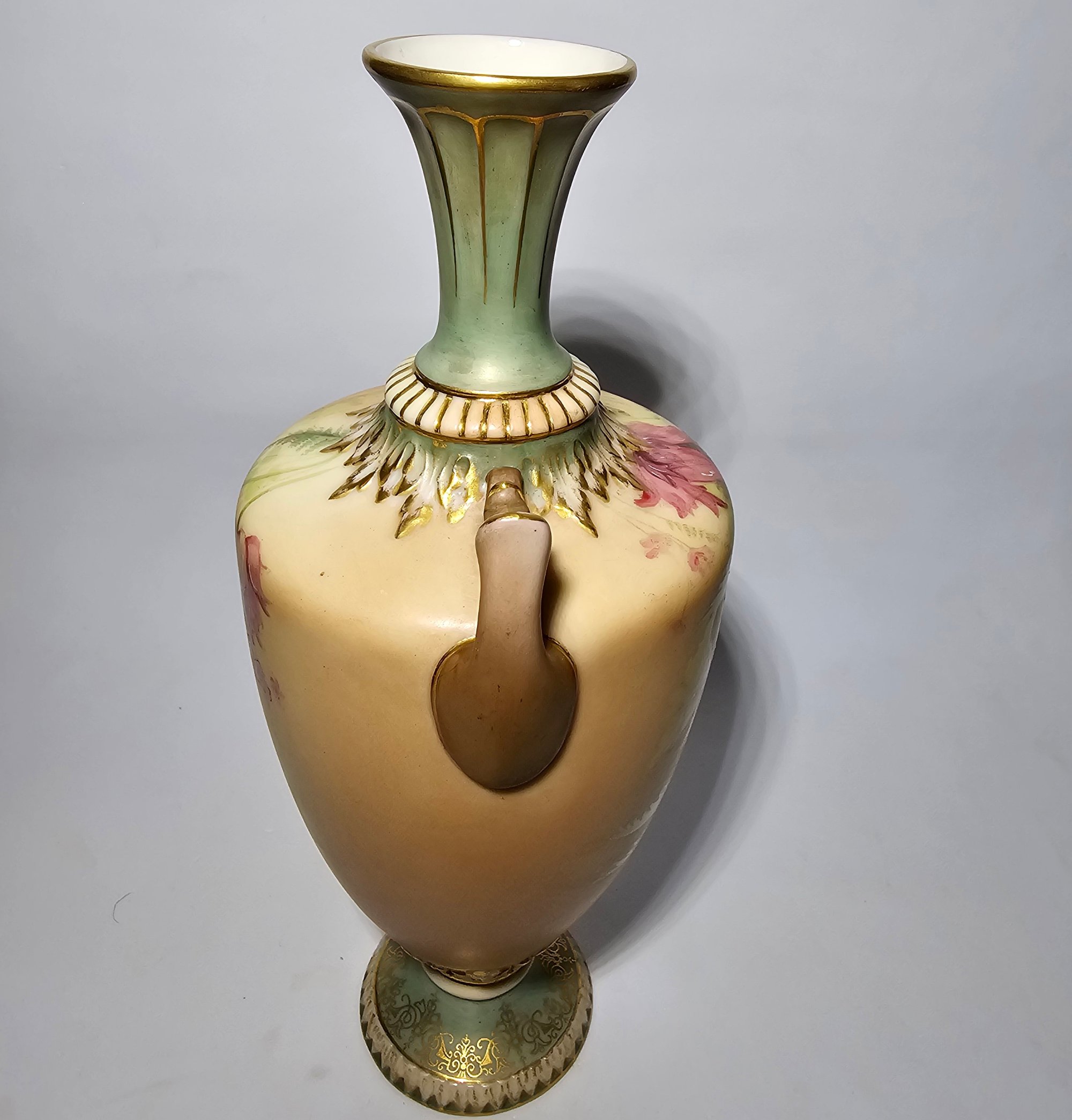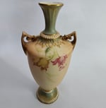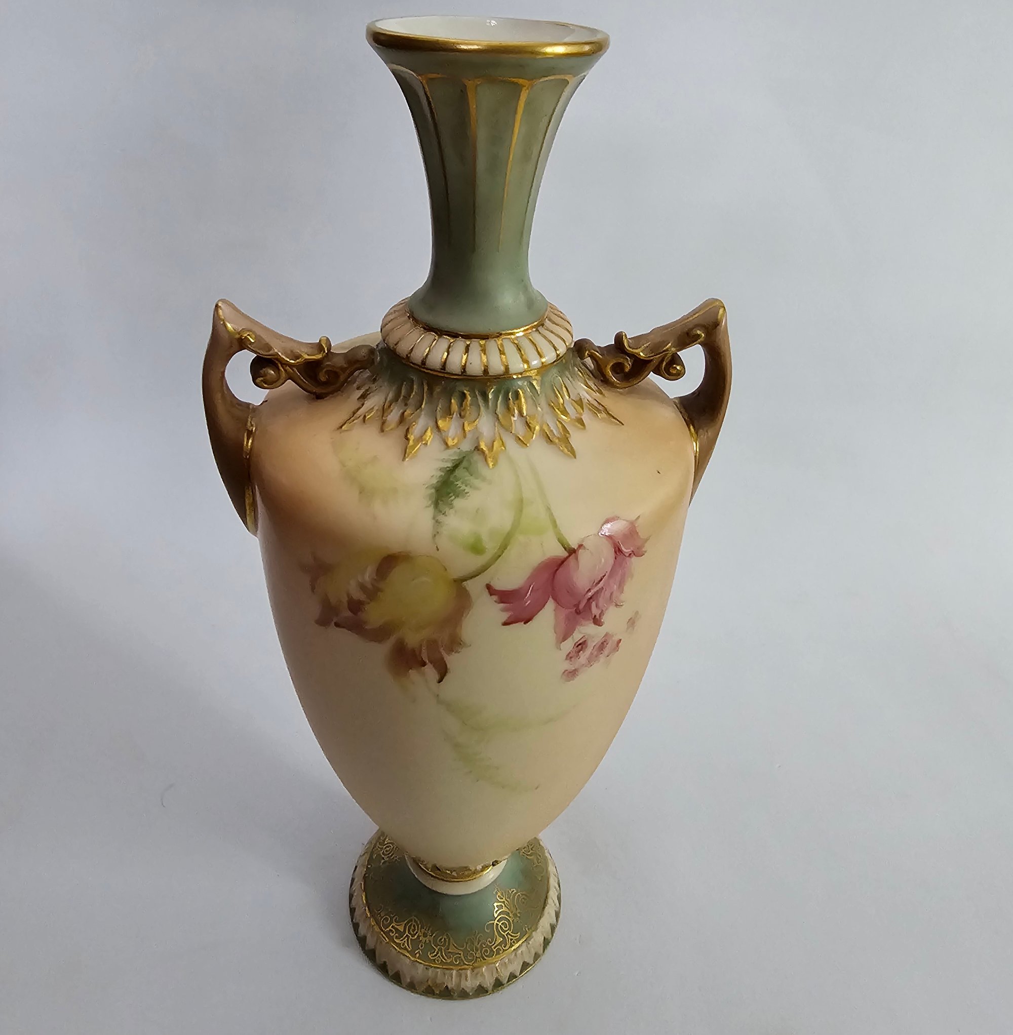 A downward tapering vase standing upon a round base with a trumpet-like neck and rim rising from an almost flat topped body. Two ornate handles rise from the vase body and rest upon the body and neck base. Raised decoration to the base of the trumpet like neck. Decorated with hand painted flowers to the front and back upon a blush ivory ground. Gilt decorative highlights to the neck, base and handles.